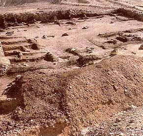 In the northeast corner of the inner enclosure, workshops and housing have been found that apparently were used by the builders of the pyramid. Here, layers of chips remain from what was apparently a stoneyard where the pyramid blocks were worked.