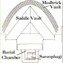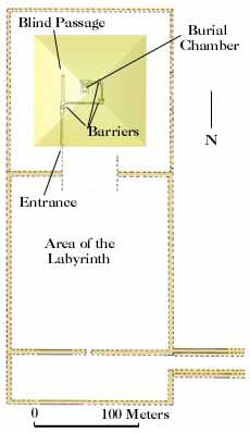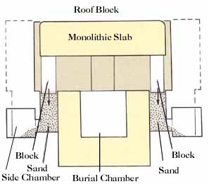 This, however, was a blind and merely filled a wide but shallow alcove. Two blind shafts in the floor, carefully filled with cut stone blocks, further wasted the robbers' time, for the real entrance to the burial chamber was even more carefully concealed and lay between the blind shafts and opposite the alcove.