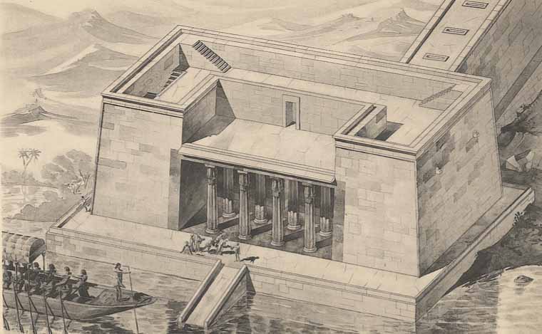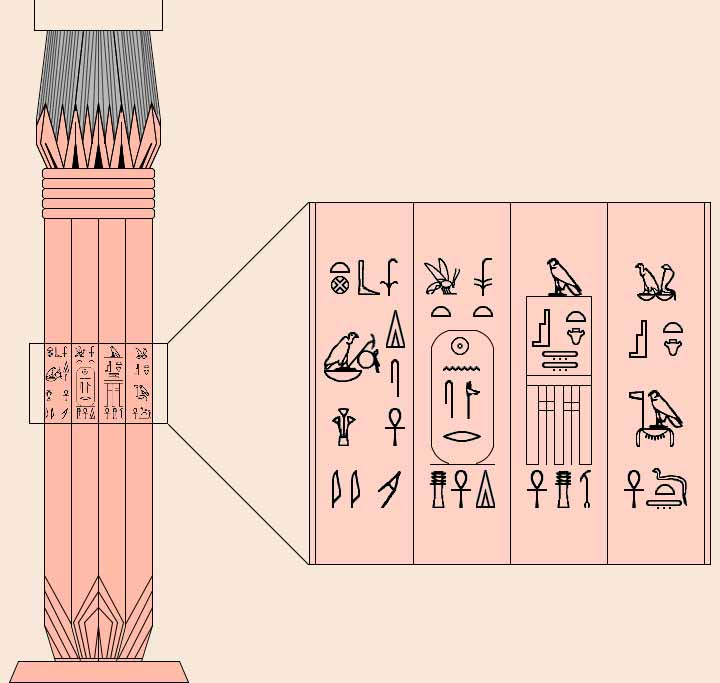 The hall terminates in a courtyard paved with black basalt and with a roofed ambulatory that was supported by sixteen six-stemmed papyrus pink granite columns. The courtyard was designed to communicate the image of a marshy papyrus grove; a place which, for ancient Egyptians, signified renewal. To evoke this image the bases of the columns, for example, were decorated with wavy bas-reliefs which produced the illusion of papyrus growing in water.