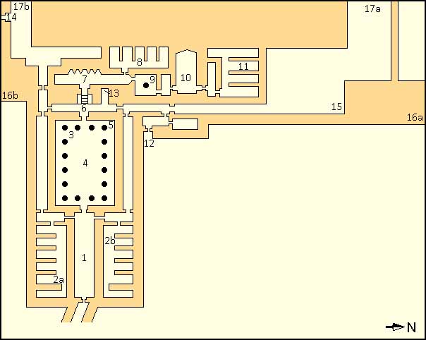 Layout of the mortuary temple. In order: (1) entrance hall and (2a and b) storage rooms; (3) columned courtyard with (4) a sandstone basin, (5) and an altar; (6) transverse corridor; (7) chapel with (8) storage rooms; (9) antichambre carrŽe; (10) offering hall with (11) storage rooms; (12) alternate entrance; (13) housing of the pink granite lion statue; (14) corridor to the cult pyramid; (15) square platform; (16a and b) pylon prototypes; and (17a and b) main pyramid courtyard.