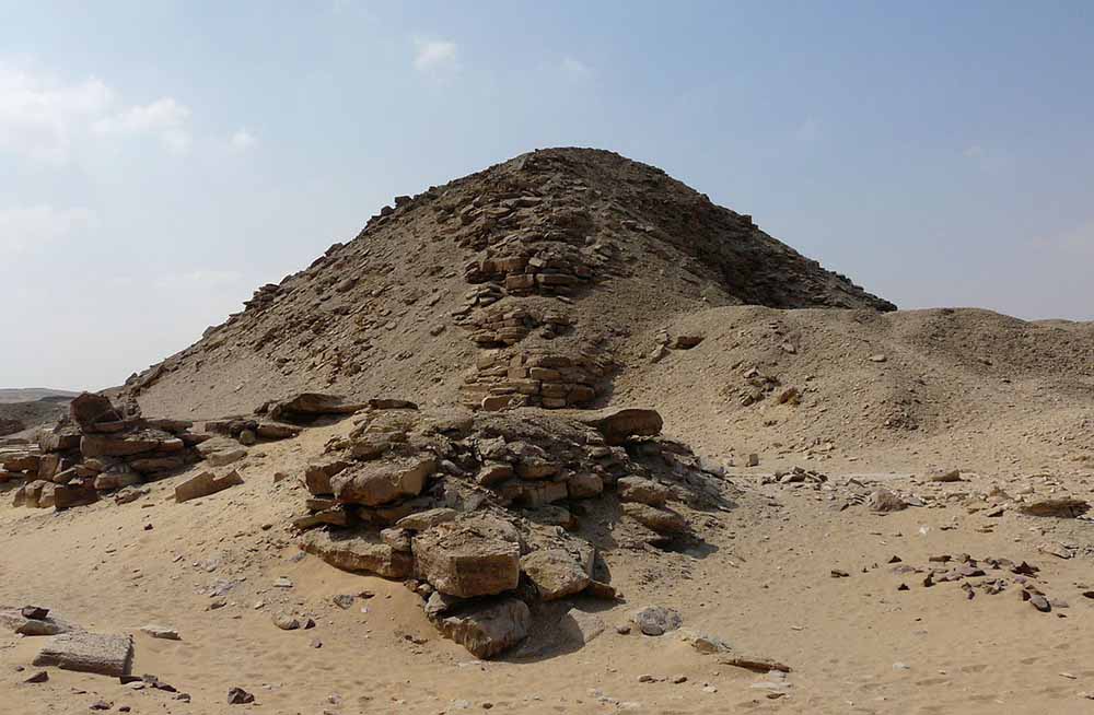 Adjoining the pyramid's east face is the mortuary temple with its unusual configuration and features. Rather than the usual T-shape plan, the mortuary temple was constructed into an L-shape; an alteration due to the presence of mastabas to the east. It introduced the antichambre carrŽe, an innovative type of new room, which became a standard feature of later monuments. It has an unexplained square platform in the temple which has led archaeologists to suggest that there may be a nearby obelisk pyramidion.