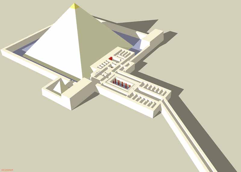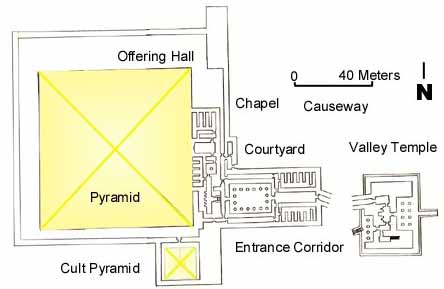 A digital reconstruction of Nyuserre's pyramid complex: main pyramid, mortuary temple, cult pyramid, and part of the causeway Old Kingdom mortuary complexes typically consist of five main components: (1) a valley temple; (2) a causeway; (3) a mortuary temple; (4) a cult pyramid; and (5) the main pyramid. Nyuserre's monument has all of these elements. Its main pyramid is constructed from seven steps of limestone, with a cult pyramid located near its south-east corner and an unusual L-shaped mortuary temple adjacent to its eastern face. The valley temple and causeway were originally intended for Neferirkare's monument, but were co-opted by Nyuserre