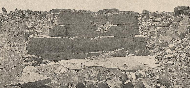 (1) The square platform may once have been occupied by a similar pyramidion; evidence supporting this conjecture are a large granite obelisk found in the pyramid complex - obelisks were the architectonic midpoints of sun temples, but not found in mortuary temples, making this discovery unique - and stone blocks containing the inscription "Sahure's sacrifice field".