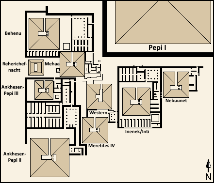 The most significant finds at Pepi I's complex are the Queens' Pyramids. As of 2018, a total of nine pyramids have been discovered in an area to the south-west of Pepi I's pyramid. These pyramids belong to: Nebuunet, Inenek-Inti, Meritites IV, Ankhesenpepi II and Ankhesenpepi III, Mehaa with a tomb belonging to her son Hornetjerikhet to its north, Behenu, Reherichefnakht and one anonymous.