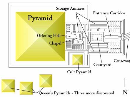 The enclosure to the complex is entered near the north-east corner off a north-south street. The doorway leads into a vestibule with a door to the courtyard in its north-western corner. The courtyard has two doorways. The first, in the south-east leads to a vestibule with two connecting rooms. To the north is a long windowless vestibule. To the west are a series of ten store-rooms. A second door in the north-west of the courtyard leads into the inner, or private, temple. Here a series of rooms can be accessed from a north-south running passage including: a windowless room, the statue chapel and the offering hall. At the south-east corner of the pyramid is a small courtyard with a cult pyramid at its center. The cult pyramid has a base length of 5.5 m (18 ft; 10.5 cu).