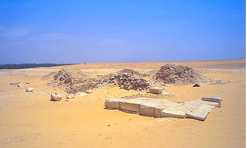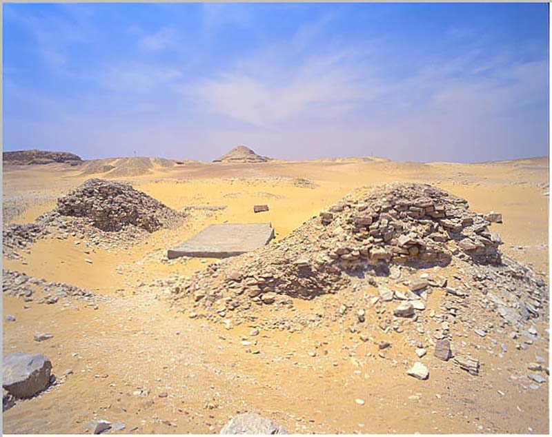 On the west side of the burial chamber is a false door and a huge granite block on which once stood the sarcophagus of the king. On the east side there is a serdab for the statue of the Ka of the deceased.