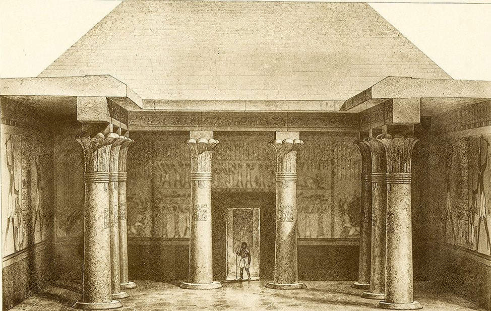The temple had two entrances. Its main entrance, in the east, consisted of a landing ramp leading to a column adorned portico. Its floor was paved with polished basalt, its walls had a red granite dado above which was limestone decorated with bas-relief, and it had a limestone ceiling that had been painted blue and decorated with relief-carved golden stars - representing the entrance into the Duat.