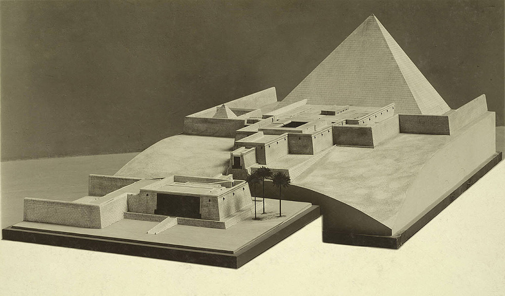 The monument consists of a main pyramid, mortuary temple adjacent the east face with a cult pyramid to its south, a valley temple on Abusir Lake, and a causeway linking the complex. The layout was developed by Sahure and adopted by succeeding kings of the Fifth and Sixth Dynasty, thus representing a milestone in pyramid complex construction. The monumentality of these constructions was drastically diminished, but, in tandem, the decorative program proliferated and temples were augmented by greater storeroom complexes.