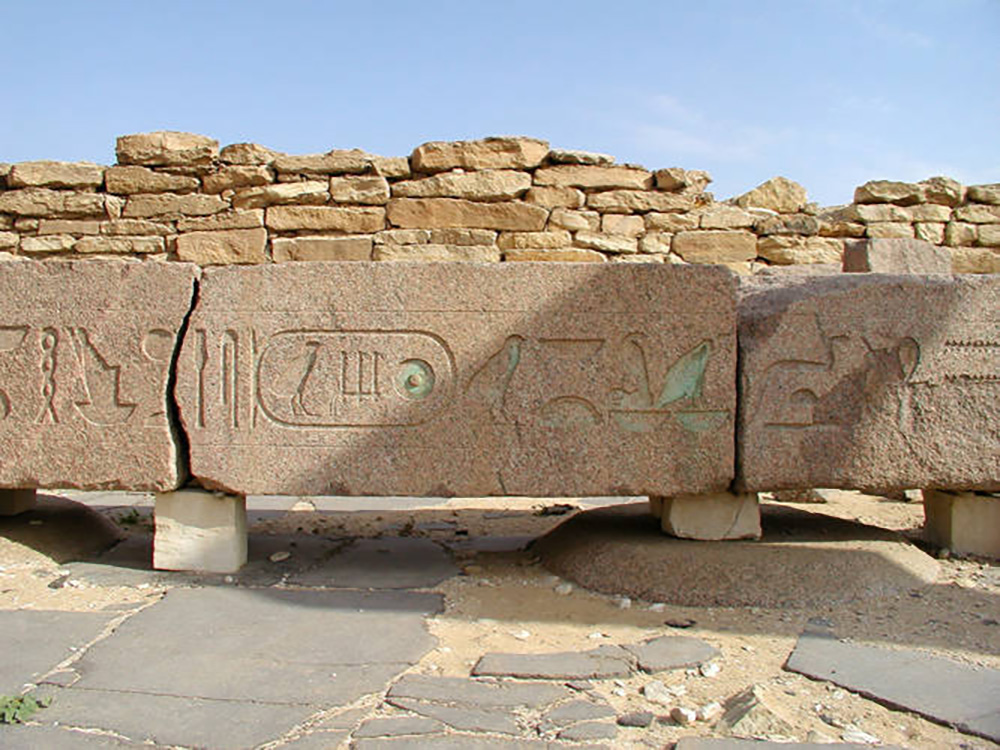 The open courtyard was paved with polished basalt and lined with sixteen red granite columns, supporting the roof of an ambulatory.Aside from an alabaster altar in the north-west corner decorated with scenes of sacrifice, the open courtyard is bare, though it originally had statues of the pharaoh placed between the columns, and may once also have contained statues of kneeling captives. Eleven of the original sixteen granite columns were found in the temple.