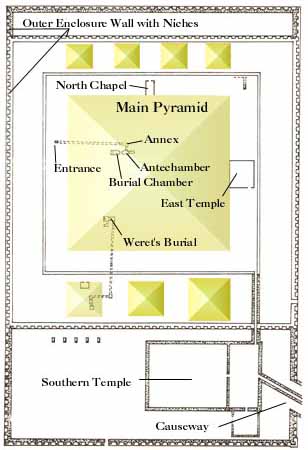 All of these structures including the main pyramid and the subsidiary pyramids were surrounded by an outer perimeter wall with a niched, exterior facade. It was north-south oriented and to the north and south another niched wall was constructed, all of which again points to a revival of interest in Djoser's Saqqara complex. An inner perimeter wall surrounded only the pyramid and north chapel.