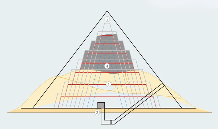 The original size of the pyramid was 144m square and 42m high. The entrance into the pyramid is on the north side up a 30m stairway. A passageway descends down 57m to a level that is below the pyramid's foundation. The passageway levels out and comes to a vertical shaft that leads up to the burial chamber. This chamber has a corbelled roof and the walls are lined in limestone. The construction timbers are still visible in this room. The chamber is on the same level as the pyramid's foundation.