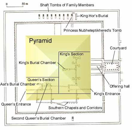 For the first time, we see a single pyramid built to accept the remains of both a king and several of his queens. Therefore, the substructure is rather complex, and differs entirely from earlier 12th Dynasty pyramids. In fact, even given the number of expected burials, it was more complex then the underground layout of earlier pyramids. The subterranean area is divided into two parts, one of which was for the king and the other for two of his consorts. The two sections are connected by a corridor. Near the southeast corner on the east side of the pyramid, at the lowest foundation layer, is located the entrance to the king's tomb.