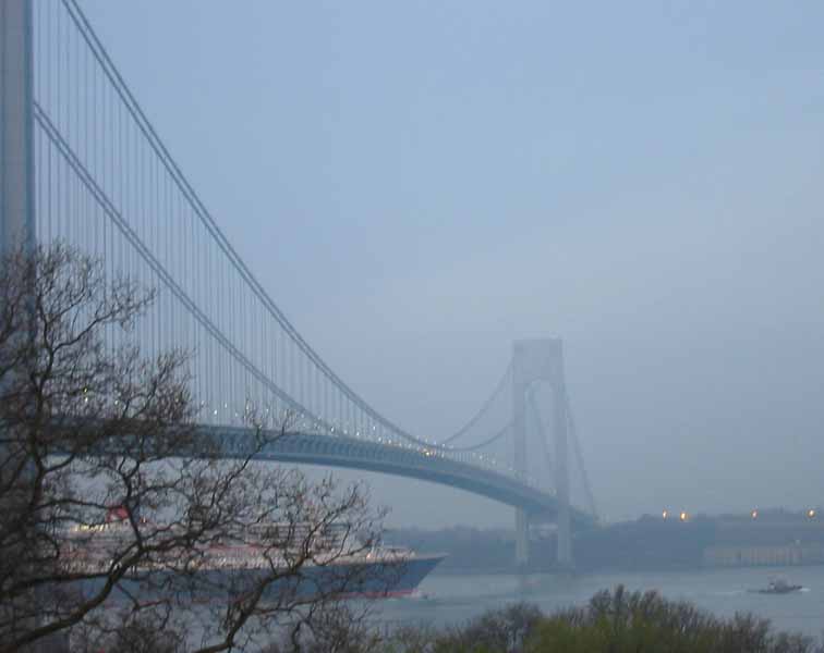 I got my digital camera and ran onto my terrace where I took the following pictures as the QM2 passed under the Verrazano Bridge. Z was watching on the other side of the bridge. I could hear a man on the ship describing the scenary and the history connected to this passage - and passing the Statue of Liberty in another minute....