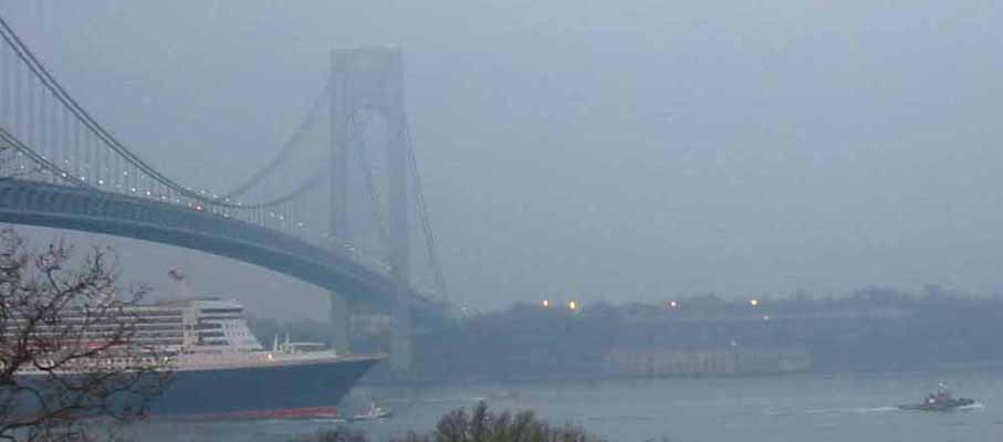The Cunard Line's newest and biggest vessel even brought its own weather -- a London-like drizzle and fog which eased off just before the vessel passed under the Verazzano Narrows bridge, clearing it by less than 20 feet.