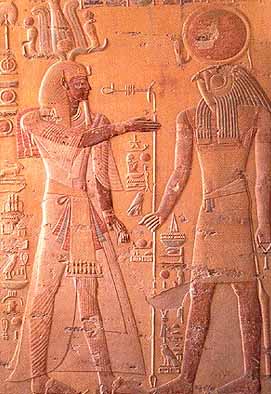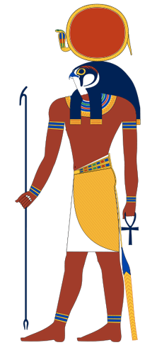 In one of his many forms, Ra has the head of a falcon and the sun-disk of Wadjet resting on his head.