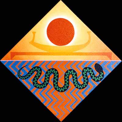 The Bennu bird (Phoenix) is Ra's ba and a symbol of fire and rebirth. The wadjet sun disk, also shown as the hieroglyphic Ankh, symbolizes the life given by the sun.