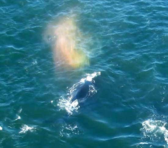 From Spaceweather.com -- "Rainbow breathing whale" sounds like a mythical creature. On July 12, 2015, Mila Zinkova of San Francisco saw one ... for real. She took this picture looking over the edge of the Golden Gate Bridge. "A few humpback whales crossed under Golden Gate Bridge and entered the Bay," says Zinkova. "Just then I saw their rainbow-colored sprays. It was beautiful!" This is not mythology. It's physics. When Zinkova took the picture, the sun was behind her back shining down into the droplet-filled exhaust of the whale's spout. Sunbeams reflecting from the water droplets produced a prismatic spray of color just like an ordinary rainbow. Of course it didn't look ordinary.