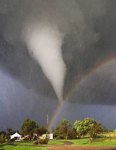 Rainbows are colorful arches that stretch high into the sky, and they end somewhere in the distance (where the fabled pot of gold can be found), right? Wrong. Rainbows are actually not arches. They form as full circles when sunlight passes through raindrops at just the right angle. However, only part of the circle - the arch - is visible to the observer on the ground. Earth's surface blocks the rest of the light - and, therefore, the rest of the halo - which is why it appears as a rainbow.