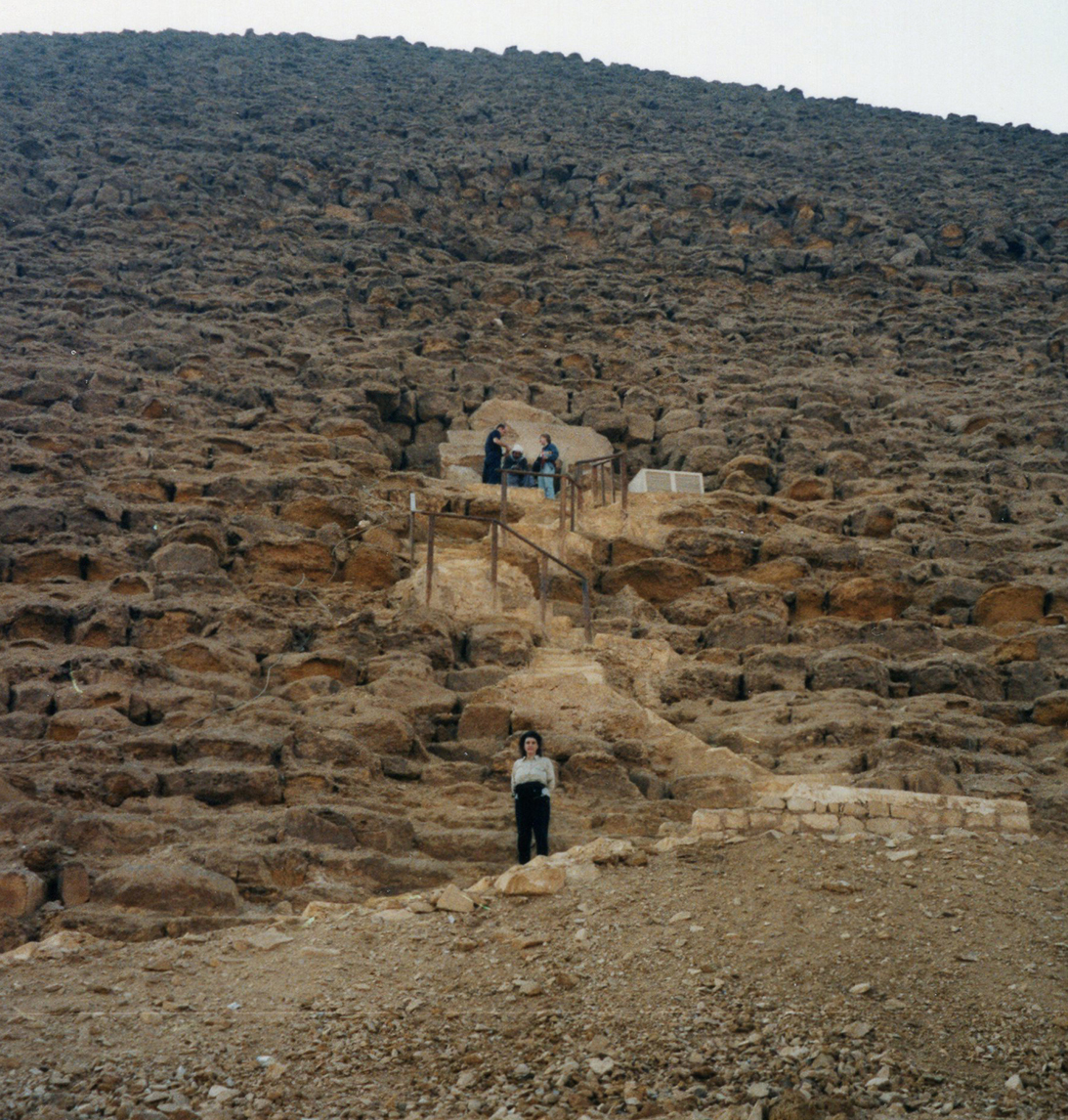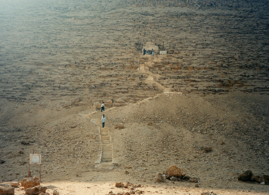 The Red Pyramid at Dashur also known as the Shining Pyramid, is one of three (or maybe even four) pyramids built by the great Pharaoh Snefru the first pharaoh of the 4th Dynasty, father of Khufu (supposed builder of the Great Pyramid), who reigned from 2575-2551 BC - in Egypt's Old Kingdom. It is the first true pyramid still remaining. The Red Pyramid gets its name from the reddish or pinkish limestone, used in its casing stones. The total area of the structure is only slightly less than the Great Pyramid, but as the angle of inclination of its sides is much shallower (43° 22"), it only reaches a height of 341 feet (104m ).