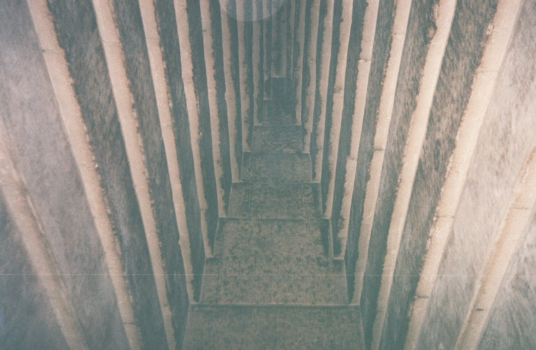 The second chamber is similar to the first and lies directly beneath the apex of the pyramid. High in the southern wall of the chamber is an entrance, now reached by a large wooden staircase built for the convenience of tourists. This gives onto a short horizontal passage that leads to the third and final chamber with a corbeled roof 50 feet (15 m) high. The first two chambers have their long axis aligned north-south, but this chamber's long axis is aligned east-west. Unlike the first two chambers, which have fine smooth floors on the same level as the passages, the floor of the third chamber is very rough and sunk below the level of the access passage. It is believed that this is the work of robbers searching for treasure in what is thought to have been the burial chamber of the pyramid.