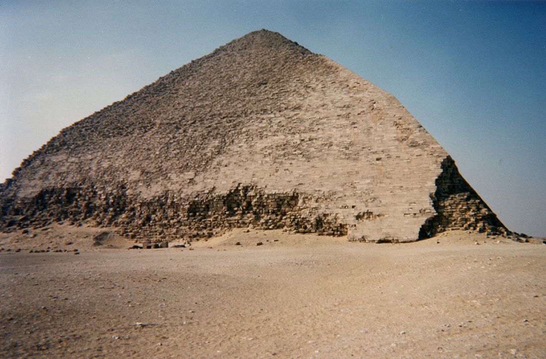 Some archaeologists now believe that the Meidum pyramid was the first attempt at building a smooth-sided pyramid, and that it may have collapsed when construction of the Bent Pyramid was already well under way Ð and that the pyramid may by then have already begun to show alarming signs of instability itself, as evident by the presence of large timber beams supporting its inner chambers. The outcome of this was the change in inclination of the Bent Pyramid, and the commencement of the later Red Pyramid at an inclination known to be less susceptible to instability and therefore less susceptible to catastrophic collapse.