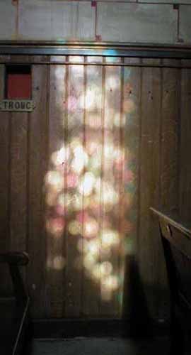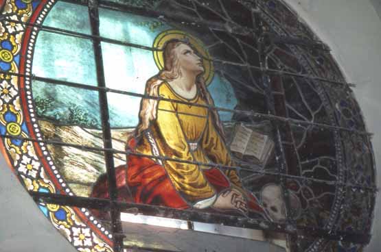 The name 'Blue Apples' or 'Pommes Bleues' in French, relates to an optical phenomenon that is said to occur at midday (12:00) on January 17 when the sun shines through a stained-glass window (Jesus Raising Lazarus from the Dead) in the church. On this day, orbs of bluish light appear on the church furnishings before stopping (then fading) on the altar with its bas-relief of Mary Magdalene kneeling in prayer with a skull at her knees.