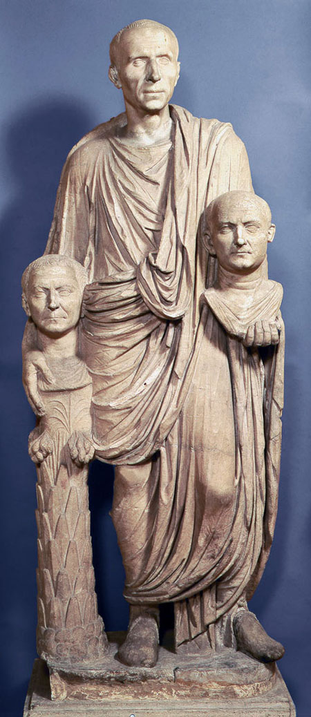Portrait sculpture from the Republican era tends to be somewhat more modest, realistic, and natural compared to early Imperial works. A typical work might be one like the standing figure "A Roman Patrician with Busts of His Ancestors" (c. 30 BC.)