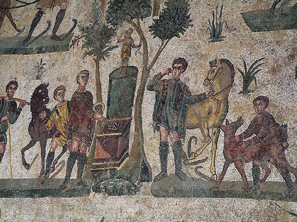 Erotic scenes are also relatively common. In the late empire, after 200AD, early Christian themes mixed with pagan imagery survive on catacomb walls.