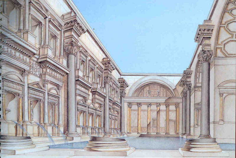 Within the frigidarium, the use of external buttresses for the cross vaults were considered by some to be the first example of the scientific system of thrusts and counter-thrusts in architecture. Concerning the baths as a whole, it has been described as evoking the Imperial style, or a "Classical" image, which is the style of "manipulation of space". To manipulate the space within this style, the forms of the building were simple and give the impression of a vast amount of open space. The builders of the baths used different techniques to create this effect. The exterior walls of the bath were encrusted with stucco to give the impression of stonework. This technique was quite common within the structures built during the Imperial style of Roman architecture, e.g., The baths of Constantine, the Basilica Nova, and parts of the Sessorian bridge. The interior parts of the bath were supported by vaulting ceilings and arches to create curvilinear lines. The structure of the roof is an excellent example of Classical design. Architects used sloped forms to cover curved extrados (the outer surface of the arch) of the vaulted halls.