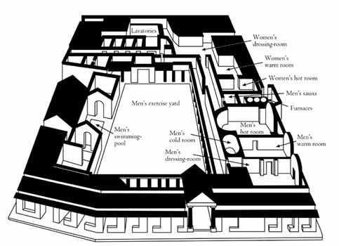 By way of illustration, this article will describe the layout of Pompeii's Old Baths adjoining the forum, which are among some of the best-preserved Roman baths. The references are to the floor plan pictured to the right.
