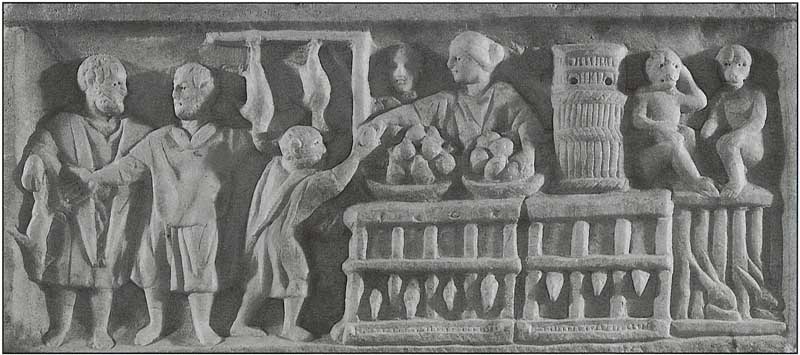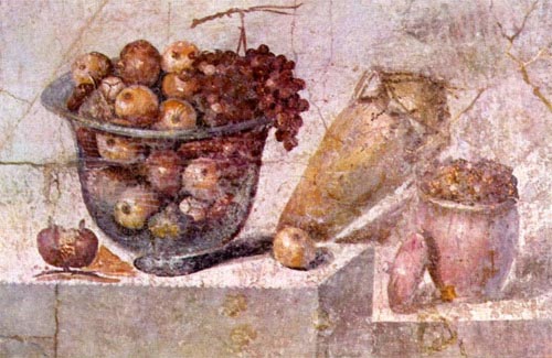 Originally flat, round loaves made of emmer (a cereal grain closely related to wheat) with a bit of salt were eaten; among the upper classes, eggs, cheese, and honey, along with milk and fruit were also consumed. In the Imperial period, around the beginning of the Christian era, bread made of wheat was introduced; with time, more and more wheaten foods began to replace emmer bread. The bread was sometimes dipped in wine and eaten with olives, cheese, crackers, and grapes. They also ate wild boar, beef, sausages, pork, lamb, duck, goose, chickens, small birds, fish, and shellfish.