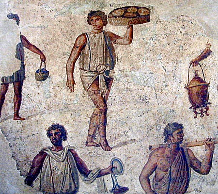 Cakes, made of wheat and usually soaked in honey, played a big part. Certain kinds of nuts were also available, and they were thrown at festivals much as sweets are today.
