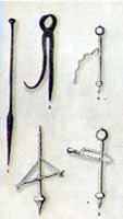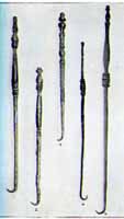 Hooks, long thin metal instruments were used as probes and the maneuvering small pieces of tissue more easily. Hooks were another common instrument used regularly by Greek and Roman doctors. The hooks the ancient doctors used came in two basic varieties: sharp and blunt. Both of these types of hooks are still used by modern surgeons' for many of the same purposes for which the ancient doctors first used them. For instance, blunt hooks were primarily used as probes for dissection and for raising blood vessels. Sharp hooks, like those pictured in the accompanying image, were used to hold and lift small pieces of tissue so that they could be extracted and to retract the edges of wounds.