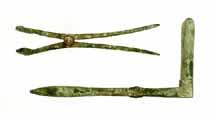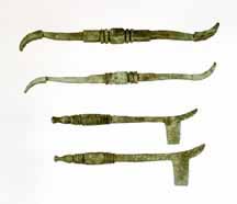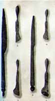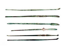 The four bronze scalpels which make up columns two and four are generally referred to as "bellied scalpels." This variety of scalpel was another favorite of physicians in antiquity since the shape of its handle allowed more delicate and precise cuts to be made.