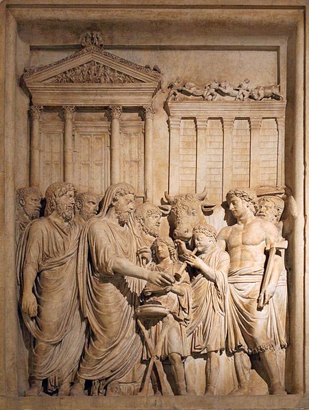 The most important camp-offering appears to have been the suovetaurilia performed before a major, set battle. A ram, a boar and a bull were ritually garlanded, led around the outer perimeter of the camp (a lustratio exercitus) and in through a gate, then sacrificed: Trajan's column shows three such events from his Dacian wars. The perimeter procession and sacrifice suggest the entire camp as a divine templum; all within are purified and protected.