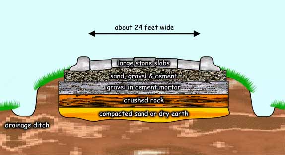 The road was constructed by filling the ditch. The method varied according to geographic locality, materials available and terrain, but the plan, or ideal at which the architect aimed was always the same. The roadbed was layered.