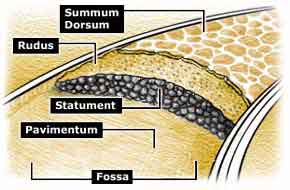 The final steps utilized concrete, which the Romans had exclusively rediscovered. They seem to have mixed the mortar and the stones in the fossa. First a several-inch layer of course concrete, the rudus, then a several-inch layer of fine concrete, the nucleus, went onto the pavement or statumen. Into or onto the nucleus went a course of polygonal or square paving stones, such as you see in the picture, called the summa crusta. The crusta was crowned for drainage.It is unclear that any standard terminology was used; the words for the different elements perhaps varied from region to region.