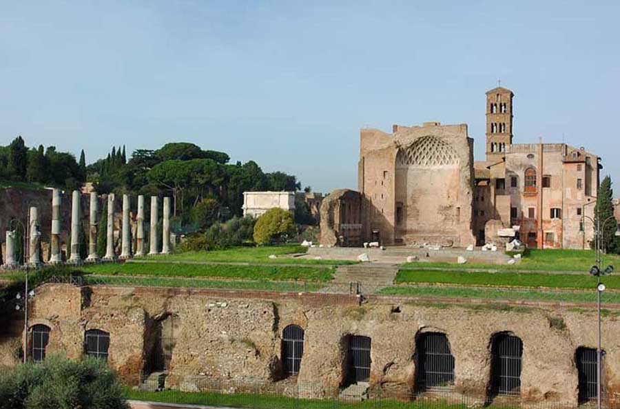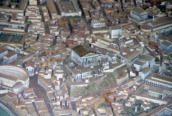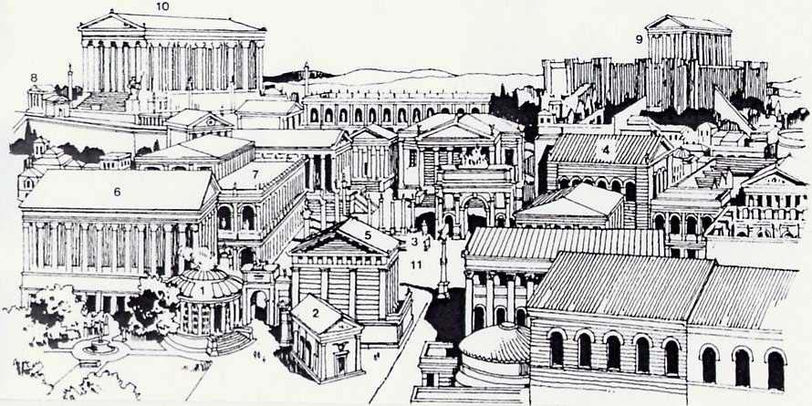 1] Temple of Vesta: 2] Regia, residence of pontifex maximus, formerly home of the kings: 3] Rostra (speakers' platform): 4] Curia (senate house): 5] Temple of Julius Caesar: 6] Temple of Castor and Pollux (rebuilt by Augustus): 7] Basilica Julia (built by Julius Caesar as an exchange and for judicial tribunals): 8] Temple of Jupiter on the Capitoline Hill: 9] Temple of Juno Moneta: 10] Temple of Jupiter Capitolinus: 11] Forum.