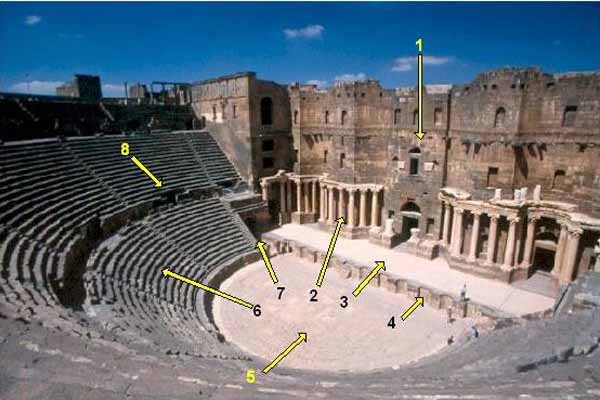 5) Orchestra 6) Cavea 7) Aditus maximus 8) Vomitorium