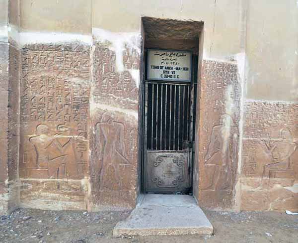 This mastaba is from the 6th Dynasty along with those of Mereruka and Kagemni. In the entrance the reliefs show scenes involving agriculture and fording. Medical scenes are shown in the doorway that leads into a five pillared room. Thus, this tomb is referred to as the Physician's Tomb. Ankh-mahor was not a physician. He was a ka-priest. The reliefs in the five-pillared room are not in good condition, however they do show mourners very graphically.