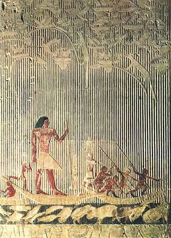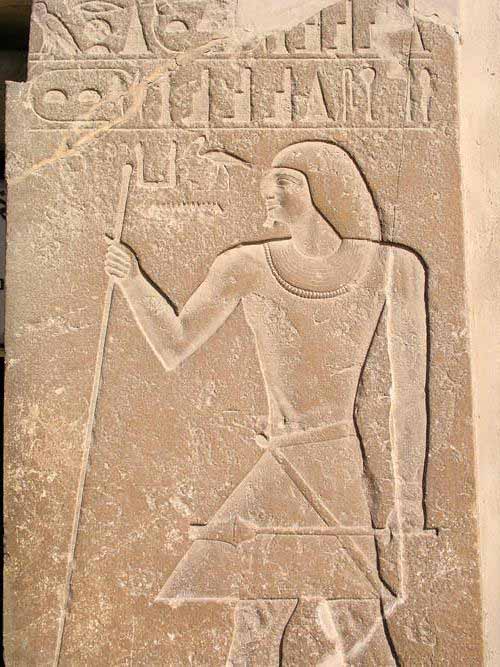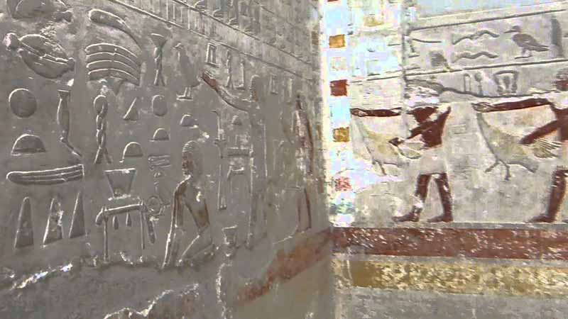 At the end of the corridor to the right to a pillard hall and then left is Ptah-Hotep's tomb chamber. The reliefs in the tomb chamber are the best preserved of the Old Kingdom. They have retained some color and are more famous than the mastaba of Ti. The ceilings in the tomb chamber are imitations of the trunks of palm trees.