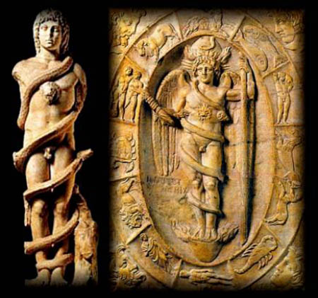 Chronos was imagined as a god, serpentine in form, with three heads - those of a man, a bull, and a lion. He and his consort, serpentine Ananke (Inevitability), circled the primal world egg in their coils and split it apart to form the ordered universe of earth, sea and sky.