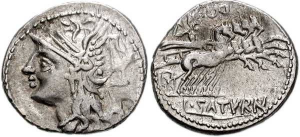In 104 BC, the plebeian tribune Lucius Appuleius Saturninus issued a denarius depicting Saturn driving a four-horse chariot (quadriga), a vehicle associated with rulers, triumphing generals, and sun gods. Saturninus was a popularist politician who had proposed free grain distribution to the poor of Rome. The head of the goddess Roma appears on the obverse. The Saturnian imagery played on the tribune's name and his intent to subvert the social hierarchy by basing his political support on the common people (plebs) rather than the senatorial elite.