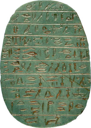 Queen Mernua's coffin has two large scarabs beside, one showing hieroglyphs on bottom. Beginning in the Old Kingdom of ancient Egypt, memorializing scarabs became common. They were often incorporated into tombs, as grave goods, or given as 'gifts'.
