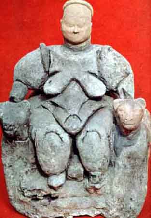 One, however - a stately seated Goddess flanked by two lions Š was found in a grain bin, which Mellaart suggests might have been a means of ensuring the harvest or protecting the food supply - a mother goddess figurine.