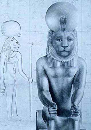 She was envisioned as a fierce lioness, and in art, was depicted as such, or as a woman with the head of a lioness, who was dressed in red, the colour of blood. Sometimes the dress she wears exhibits a rosetta pattern over each nipple, an ancient leonine motif, which can be traced to observation of the shoulder-knot hairs on lions. Tame lions were kept in temples dedicated to Sekhmet at Leontopolis.