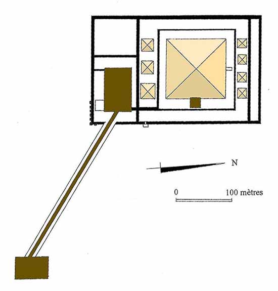 The original project included the main pyramid along with a northern chapel and a small eastern mortuary temple, all surrounded by an enclosure wall. Outside this enclosure were seven tombs belonging to Senusret's queens and princesses, and the whole complex was again surrounded by an outer wall; this wall was enlarged during the works in order to accommodate a large temple on the southern side and a causeway.