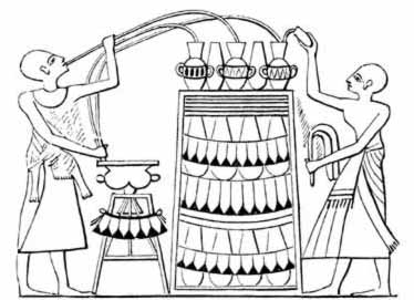 Beheading was commonly carried out by the victim resting their head on a wooden block, and so Shezmu was referred to as Overthrower of the Wicked at the Block. This violent aspect lead to depiction, in art, as a lion-headed man, thus being known as fierce of face. In later times, Egyptians used the wine press for producing oils instead of wine, which was produced by crushing under foot instead. Consequently, Shezmu became associated with unguents and embalming oils, and thus the preservation of the body, and of beauty.