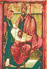Reports of Jesus's burial shroud have been circulating since the 14th century, and attempts have been made since then to connect the "Shroud of Turin" with the "Image of Edessa" though no connection can be substantiated. The 10th-century image shows Abgarus of Edessa displaying the Image of Edessa. The oblong cloth shown here is unusual for depictions of the image, leading some to suggest that the artist was influenced by seeing the Shroud.