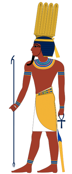 He was generally depicted as a man wearing an ostrich feather headdress, holding a sceptre and the ankh sign of life. Sometimes he is shown wearing the sun disk on his head, linking him to the sun. Occasionally, when shown with his sister-wife Tefnut, he is shown in lion form and the two were known as the "twin lion gods". At other times, he was shown with the hind part of a lion as his headdress, linking him to his leonine form. Mostly, he was shown with his arms raised, holding up the goddess Nut as the sky, standing on the body of Geb. One story says that Shu and Tefnut went to explore the waters of Nun. After some time, Ra believed that they were lost, and sent the his Eye out into the chaos to find them. When his children were returned to him, Ra wept, and his tears were believed to have turned into the first humans. Shu was created by asexually or by spitting, the first born of the sun god. He seems to be more of a personification of the atmosphere rather than an actual god.